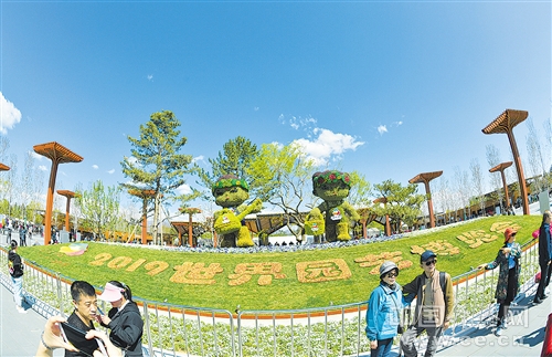 游客在北京世园会门前拍照留念。 经济日报-中国经济网 记者高兴贵/摄