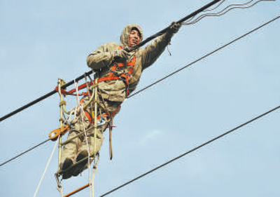 许启金穿着屏蔽服在220千伏输电线路上带电消缺。张勇/摄(影像中国)