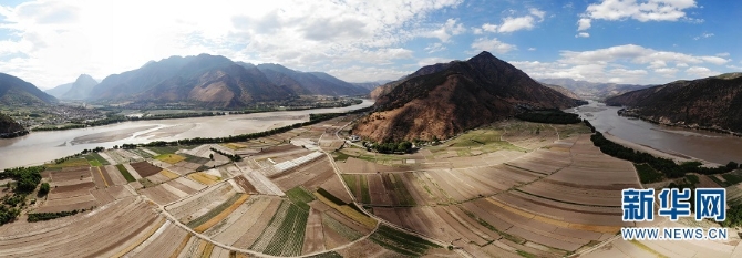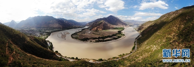 “长江第一湾”位于云南省丽江市石鼓镇与香格里拉县沙松碧村之间。长江从青藏高原奔腾而下,从四川甘孜州巴塘县进入云南,与澜沧江、怒江一起在横断山脉的高山深谷中穿行形成了“三江并流”的壮丽景观。到了石鼓镇和沙松碧村之间,突然来了个100多度的“急转弯”,形成罕见的“V”字形大弯,人们称这天下奇观为“长江第一湾”。新华网发(王俞/摄)