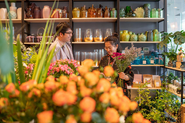 阿里人喜欢花,尤其是男同学们最爱玫瑰。在这间十几平方米的小小花店里,每天能卖出515支花。