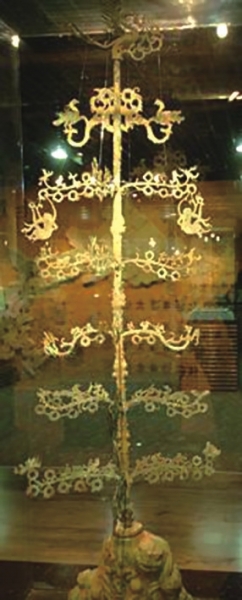 走进展馆,映入眼帘的便是这株姿势秀挺的东汉摇钱树,它的顶端是一只展翅飞翔的凤凰,树冠分为6层,每层两片叶子,树干、树枝上分别饰有传说中的神兽等图案,它也是展馆的镇馆之宝。