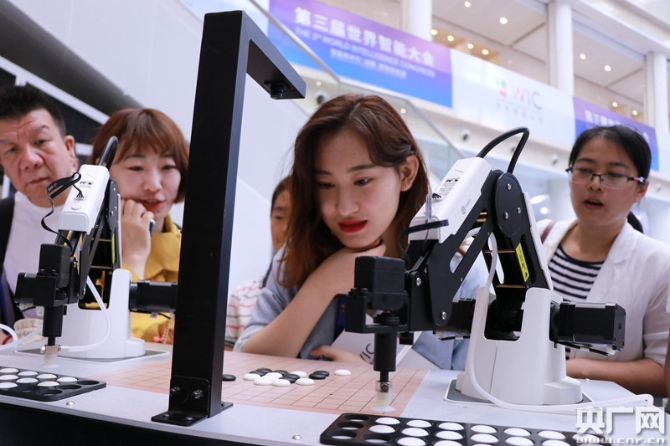 在第三届世界智能大会科技展上,观众与机器人进行五子棋比赛,机器人有条不紊地与市民进行对决。(央广网记者 刘阳 摄)