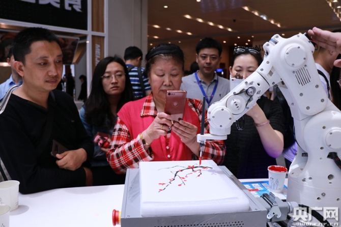 市民观看机器人作画,机器人通过前期设定在纸张用毛笔作画,画笔笔触深浅都与原作几乎相近。(央广网记者 刘阳 摄)