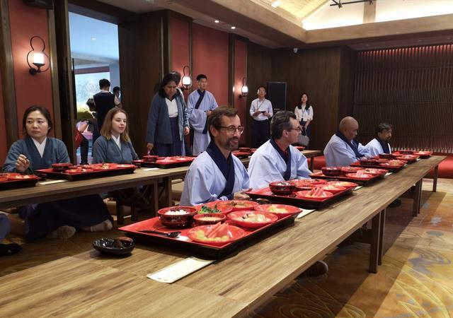 陈福、请箸、谢福、敬天地、进餐……5月17日中午,在曲阜尼山书院酒店,身着汉服的外国友人体验了尼山食礼。“以前是通过书本了解到儒家文化,这次来山东,才真正感受到儒家文化的博大精深。”进餐时,乌兹别克斯坦记者创作联合会副主席霍穆罗德·萨利莫夫拿出手机记录了整个过程,他要带去回给家人观看。稍晚,外国友人来到在孔府、孔庙参观,大家一边聆听讲解员介绍,一边拍照留念。