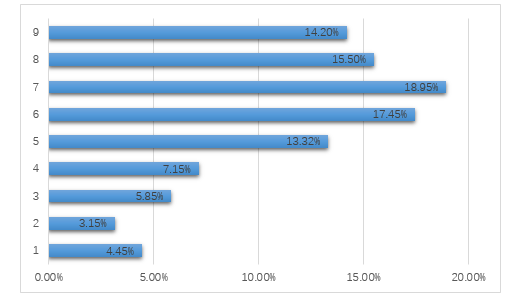 在关于创业政策支持效果的调查中,企业对税收减免政策的评价总体较好。数据显示,评价6分及以上的创业者占比高达66.1%,可见当前税收减免政策的总体效果企业较为认可。14.2%的创业者对当前的税收减免政策非常满意,给出了满分9分的评价。受调查创业者中,评价7分的创业者占比最高,为18.95%。
