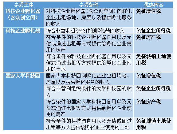 创业初期,企业的成长国家离不开孵化器、高校创新创业平台等创业就业平台的扶持。为此,国家对扶持企业成长的科技企业孵化器、国家大学科技园等创新创业平台给予税收优惠,激发创业就业平台扶持企业的积极性,以帮助创业企业发展壮大。