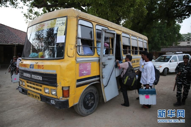 5月19日,在印度北方邦的瓦拉纳西的一处投票站外,工作人员携带装箱的电子投票系统准备乘公共汽车离开。印度大选最后阶段投票于当地时间19日18时结束,这标志着2019年印度全国大选投票全部结束。 新华社记者赵旭摄