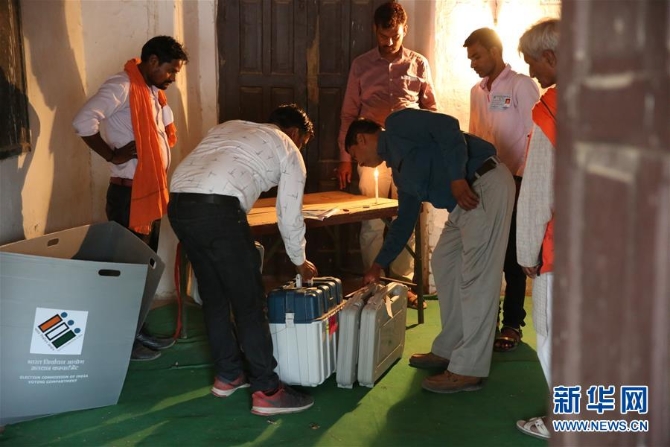 5月19日,在印度北方邦的瓦拉纳西的一处投票站,工作人员检查装箱的电子投票系统。印度大选最后阶段投票于当地时间19日18时结束,这标志着2019年印度全国大选投票全部结束。 新华社记者赵旭摄