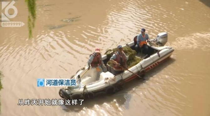 20日中午,在盘龙江圆通大桥附近,记者看到,河道内的水流确实比较浑浊,泛着土黄色,水草裸露,水流也没有之前那么顺畅。有几名河道保洁员正在打捞水草……