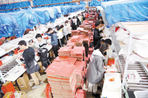 贝泰妮物流中心处,工作人员正在包装发货。 贝泰妮集团股份有限公司供图