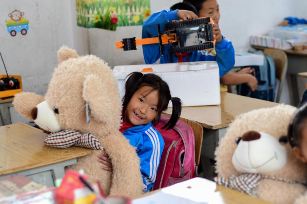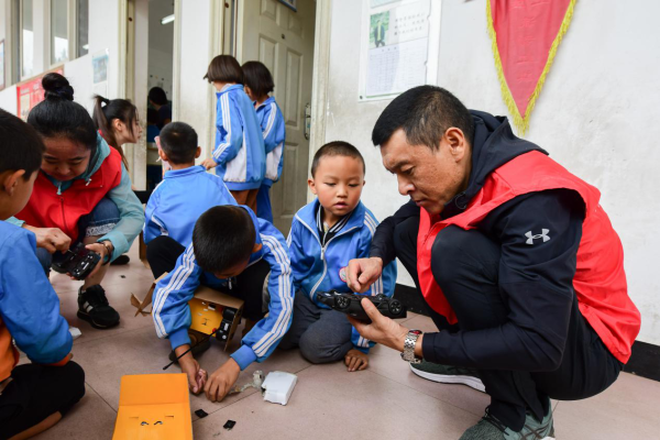 教室里、走廊上,孩子们的张张笑脸感染了到场的志愿者,二年级的杨川平小朋友,拿到自己的遥控挖机后,抱着礼物迈开了“六亲不认的步伐”,在微信活动群内看到图片的志愿者也纷纷点赞,“看到孩子们这么开心,值了!”