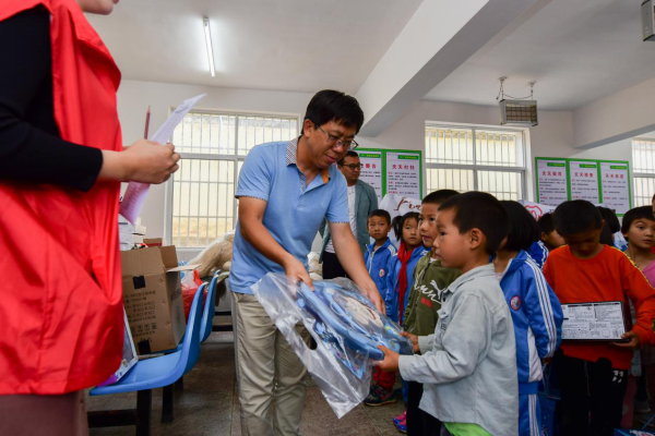 散旦中心小学周校长为孩子发礼物 陈昱州/图