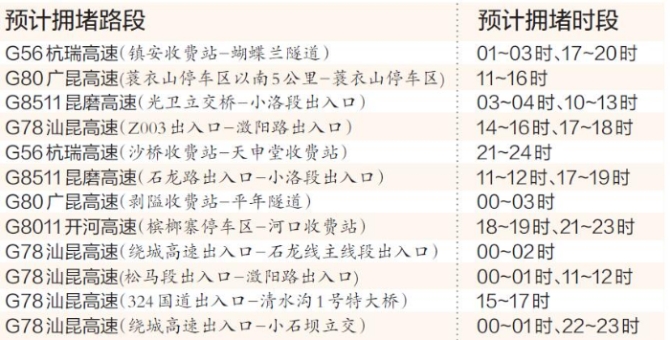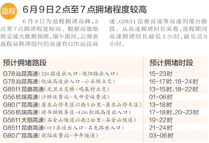 从收费站拥堵情况看,6月7日-9日,预计较为拥堵的收费站主要是胜境关收费站、小喜村收费站、河口收费站、昆明收费站。其中胜境关收费站拥堵时长达2.7小时,车速为14公里/小时。