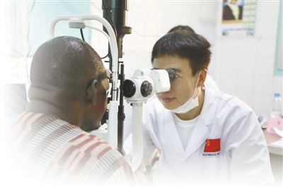 第十七批援塞内加尔医疗队队员正在给当地患者检查眼睛。