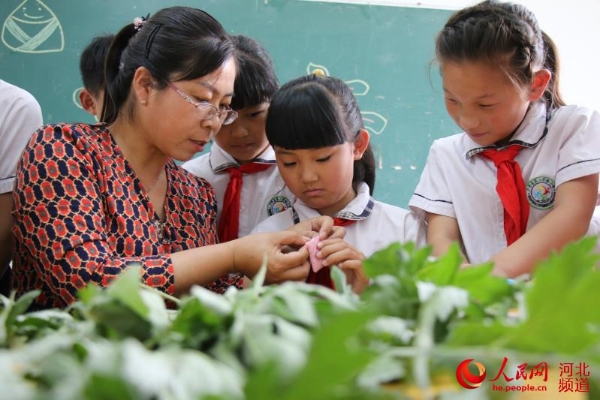 河北省邯郸市广平县第二实验小学学生在老师的帮助下缝制香囊。