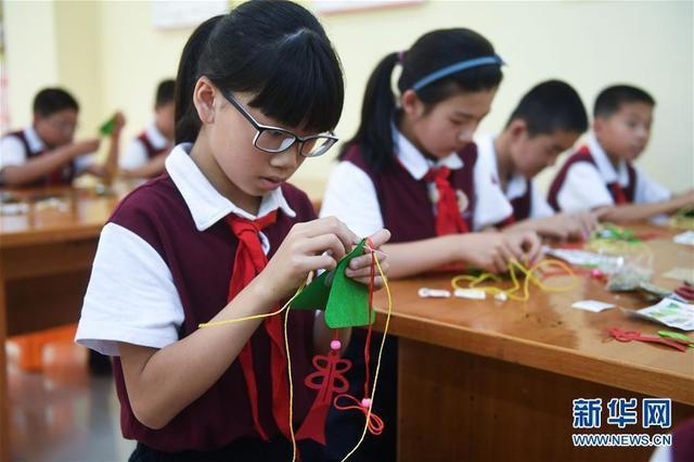 6月4日,洲泉镇洲泉实验小学的学生们在端午民俗课上学习香袋的制作。 新华社记者徐昱 摄