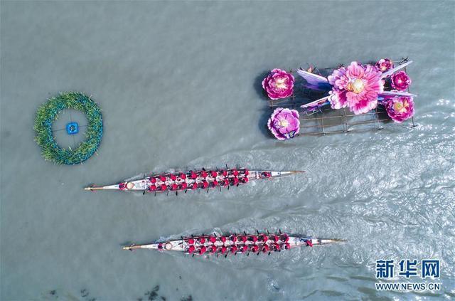 6月4日,桐乡市洲泉镇的龙舟队在湘溪公园旁的河道中开展训练,他们将代表桐乡参加2019嘉兴端午民俗文化节的龙舟竞渡(无人机拍摄)。新华社记者 徐昱 摄