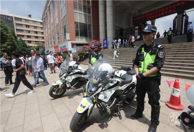 8时左右,云大附中考点门口,一位考生由于未带身份证向交警求助。执勤交警立即带着该考生骑车前往考生住址江岸小区取身份证。途中,骑巡民警为考生保通开道,在沿线各岗点民警的配合下,仅用了10多分钟时间,就及时将考生送达考点,并顺利进入考场参加考试。