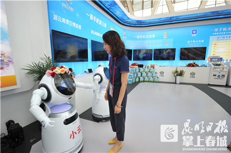 昆明信息港讯 (昆明日报 全媒体记者李思凡) “小云,今天石林的天气怎么样?”“石林中雨,中级风,小心迷伤眼镜。预计气温19至27摄氏度,此刻25摄氏度。空气质量超赞,心旷神怡啊!怕你淋湿,记得带伞。”在本届商洽会5G展示区,“游云南”App人工智能机器人“小云”“小南”从线上来到线下,吸引观展者与它们互动。