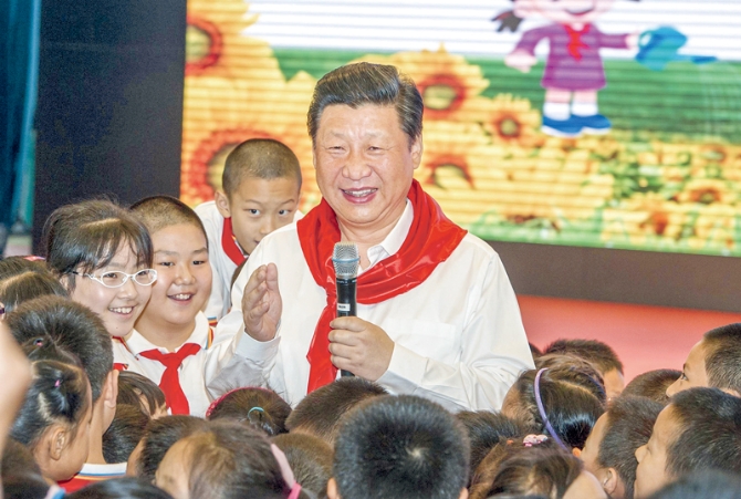 2014年5月30日上午,中共中央总书记、国家主席、中央军委主席习近平来到北京市海淀区民族小学,参加庆祝“六一”国际儿童节活动。这是习近平在参加少先队入队仪式时,向少先队员们致以节日问候。 新华社记者 谢环驰/摄