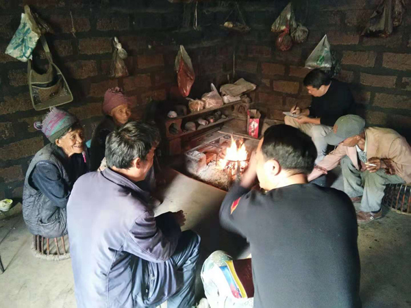 沈斌(图右靠墙)在村民家的火塘边登记信息。耿马县委组织部供图