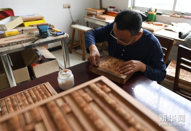 在位于扬州杭集镇自家老屋的工作室内,陈义时在对“活字”进行排版(6月18日摄)。 新华社记者季春鹏/摄
