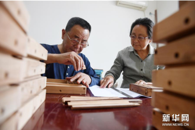 在位于扬州杭集镇自家老屋的工作室内,陈义时(右)在和老伴徐夏娣查看雕刻的“活字”(6月18日摄)。 新华社记者季春鹏/摄