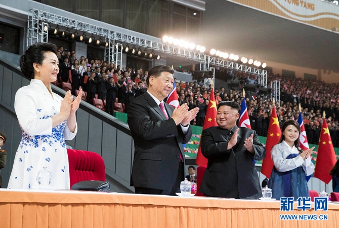 当地时间6月20日晚,中共中央总书记、国家主席习近平和夫人彭丽媛在朝鲜劳动党委员长、国务委员会委员长金正恩和夫人李雪主陪同下,在平壤“五一”体育场同朝鲜各界群众一道观看大型团体操和艺术演出。