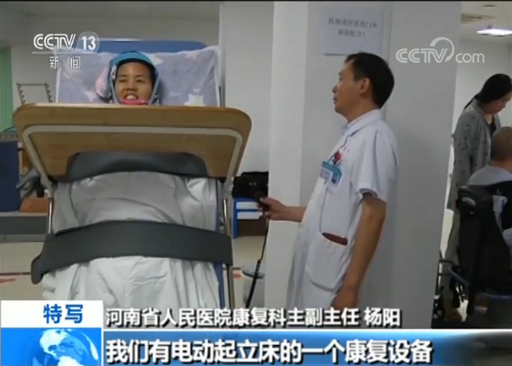 河南省人民医院康复科主副主任 杨阳:以前我们都是让她斜躺30分钟就可以了,但是答辩的时候你想一般人要稍微坐一下的感觉,她答辩的时候要接近40度、50度,我们有电动起立床的一个康复设备,然后让她在这个设备上不断的适应。