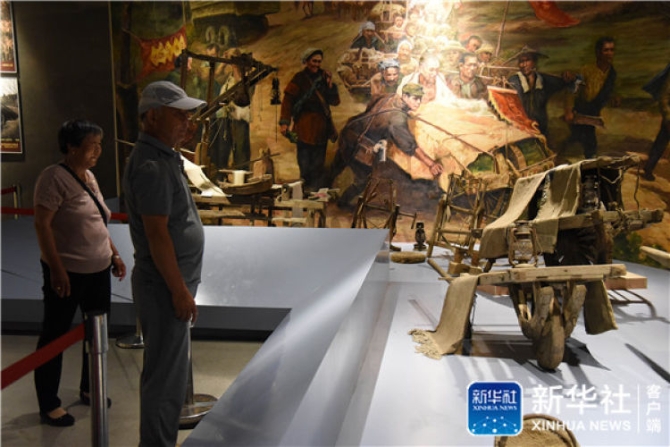 ↑6月9日,游客在孟良崮战役纪念馆内参观孟良崮战役期间使用过的小推车。新华社 记者王凯/摄