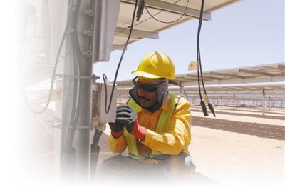 埃及南部城市阿斯旺光伏电站项目的工人正在检修设备,该项目由中企承建。记者周輖/摄
