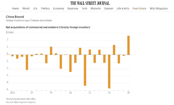 这是Real Capital公司自2007年开始统计该数据以来,单季度外国投资者购买金额最高的一次。外国投资者的热情表明,他们的态度发生了逆转。2013年至2018年的大部分时间里,这些投资者都是净卖家,抛售中国的写字楼、购物中心、仓库和其他类型的商业地产。