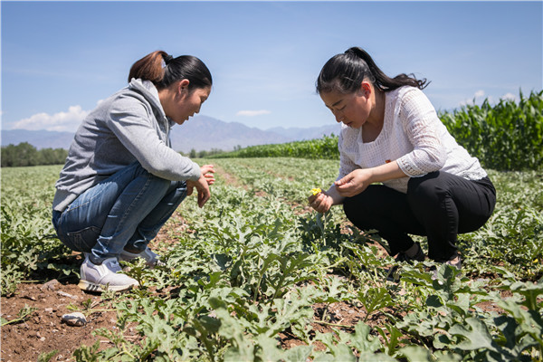 王平与职工在地里查看作物生长情况。中国网记者 伦晓璇 摄