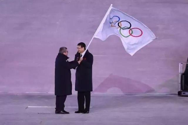 ↑在2018年平昌冬奥会闭幕式上,北京市市长陈吉宁从国际奥委会主席巴赫手中接过五环旗,冬奥会正式进入北京时间。