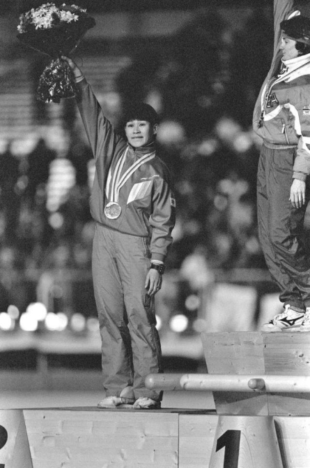 ↑叶乔波在领奖台上向观众挥手致意。新华社记者 李根兴/摄