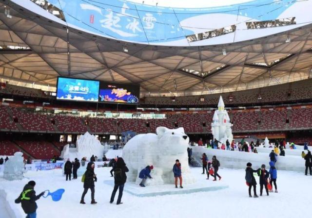 ↑2018年12月29日,第十届“鸟巢”欢乐冰雪季正式启动,游客体验各项活动。新华社记者 张晨霖/摄