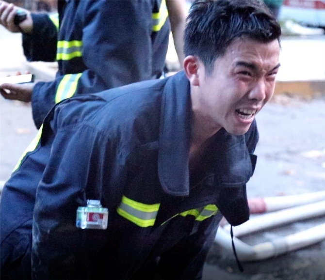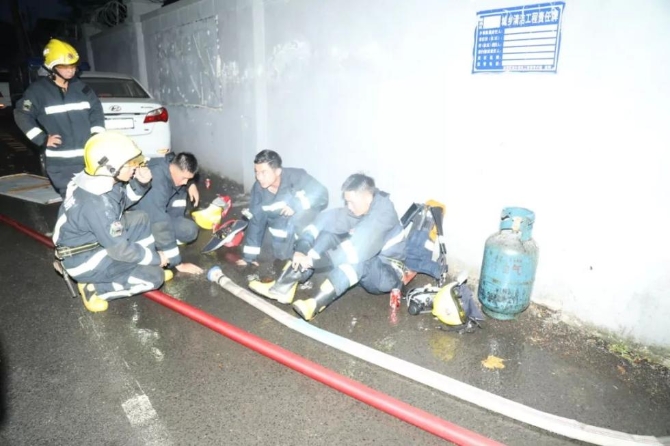 我们6点30分吃饭,我是刚吃到一半接到报警就出来了,进入宾馆搜救里面压根看不清,摘掉呼吸面罩吸入了浓烟,在里面高强度的搜救,所以出来有点累吐了。