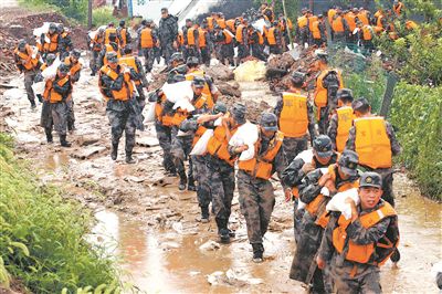 8月11日,第80集团军某旅官兵火速展开救援。图为官兵搬运沙袋加固大堤。仇成梁 摄