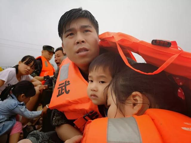 7月9日,衡阳市衡东县,衡阳支队官兵用救生衣为两名孩子遮风挡雨。