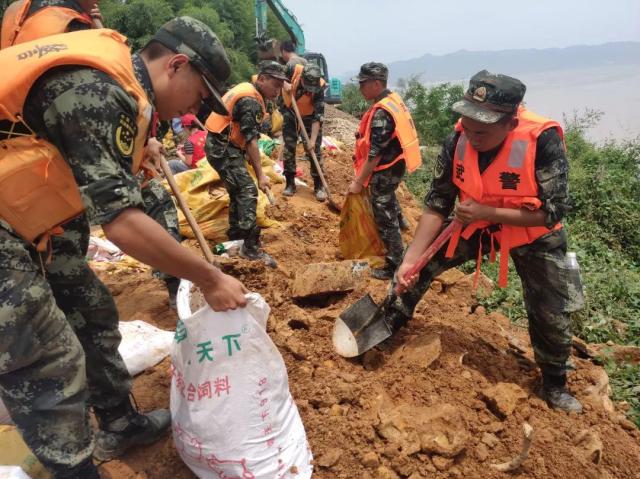 7月10日,衡阳支队官兵正在组织装填沙袋。