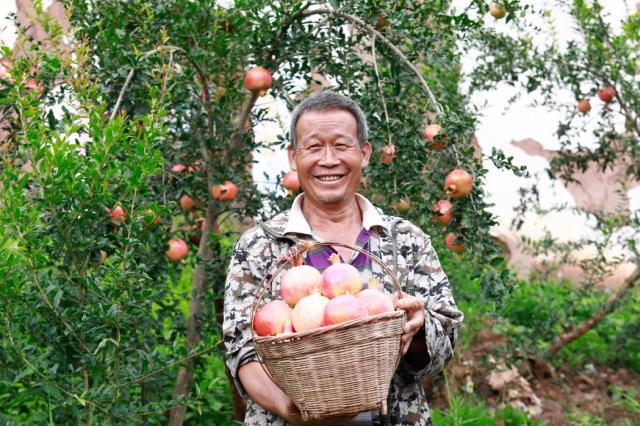 当地果农手捧刚采摘的会理石榴,农民通过拼多多平台“有产就有销,多劳能多得”,喜悦溢于言表。
