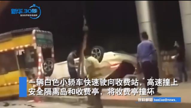 事故造成白色轿车严重受损,收费站设施损坏,收费员重伤送医院紧急救治。