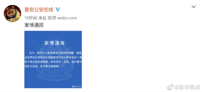 福建省福州市公安局晋安分局18日通报,该局近期接到报警,福建某运动用品公司收到由美国联邦快递公司承运的一美国客户寄出的快递包裹,内有枪支。目前,福州警方已将枪支暂扣,并开展立案调查。(记者韩洁 王成)