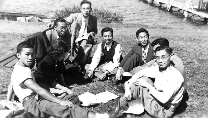1949年,梁思礼(左一)与留美学生参加CSCA小组会