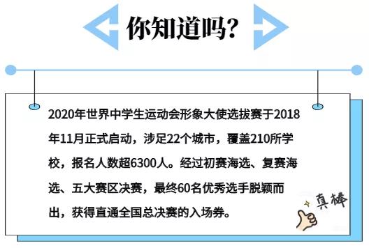 据了解,2020年世界中学生运动会开幕式倒计时一周年活动,组委会将正式授予获奖选手形象大使、风尚大使、文化推广大使、青春大使、体育推广大使以及网络推广大使荣誉称号。