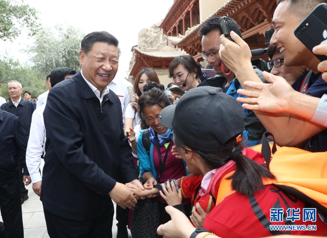 习近平在敦煌莫高窟考察调研时,向正在参观的游客亲切招手致意。