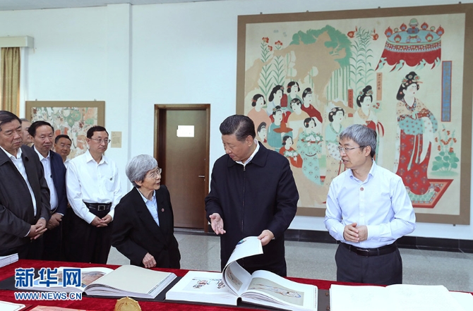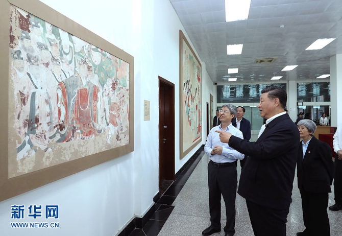 习近平在敦煌研究院察看珍藏文物和学术成果展示,了解文物保护和研究、弘扬优秀历史文化情况。