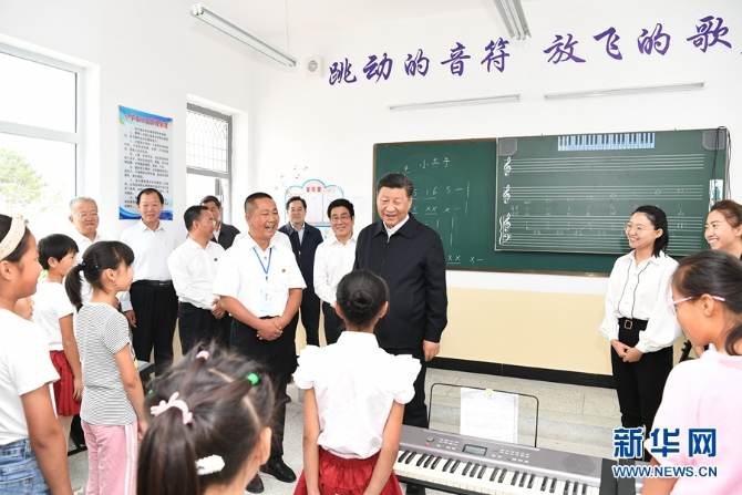 习近平在武威市古浪县黄花滩生态移民区富民新村富民小学的音乐教室,认真观看正在进行的音乐课教学。