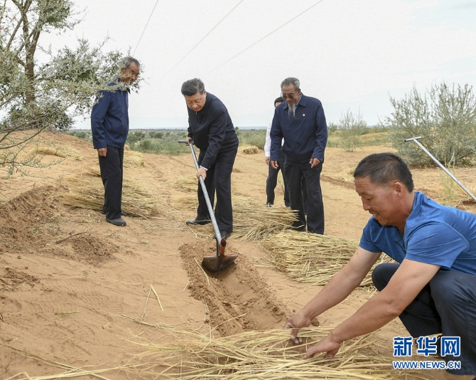 习近平在武威市古浪县八步沙林场实地了解“草方格压沙”作业。