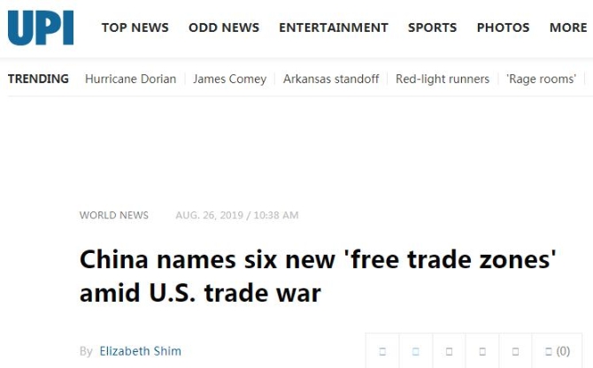 美国合众国际社(UPI)26日报道称,在中美贸易战愈演愈烈的背景下,中国宣布设立六个新的自贸试验区。这显示了中国进一步促进货物和投资自由流动的意愿和决心。